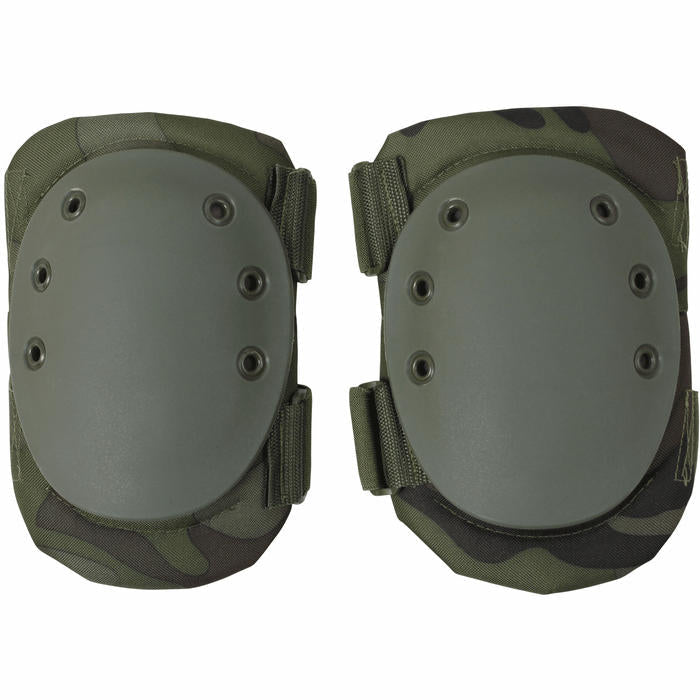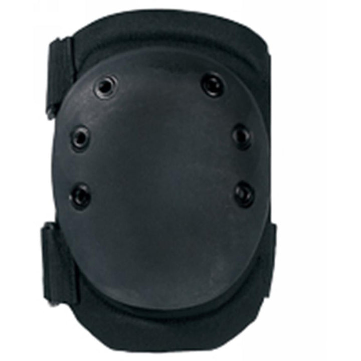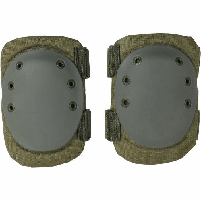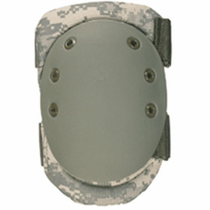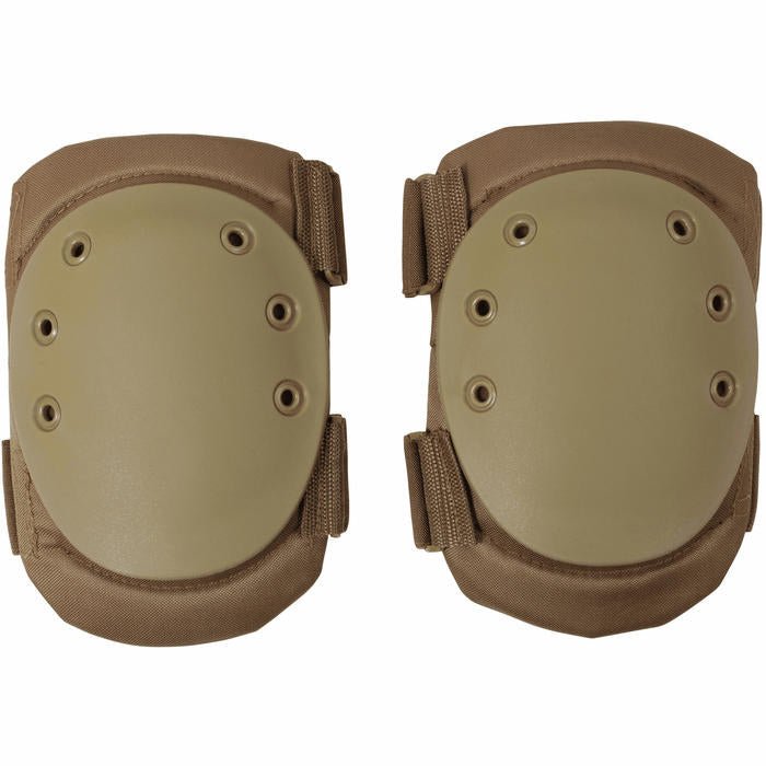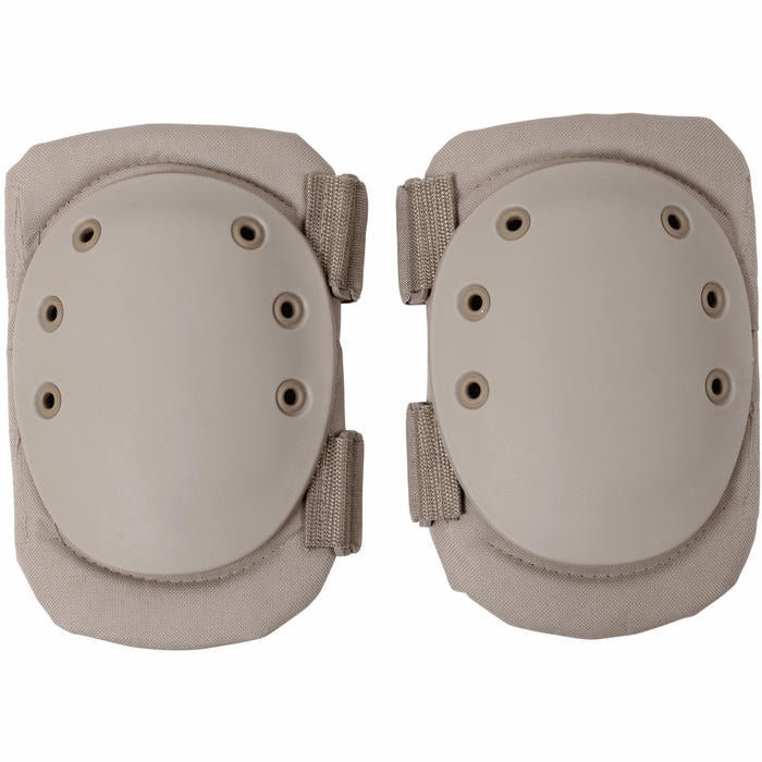 These knee pads have a rubber no slip cap. All metal fitting are subdued (don't reflect). Material is 900 denier polyester with 1/2 inch of foam padding. Two straps with hook and loop secure these pads to your knees.