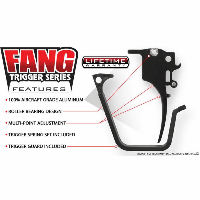 TechT Aluminum Fang Trigger with Trigger guard for the Tippmann Phenom. Features dual roller bearings and 2 point adjustable. Kit includes our new Soft Double Trigger Guard, Trigger Spring Kit, and a Lifetime Warranty. Walking the trigger has never been so easy! All TechT Triggers come with a lifetime warranty and are made in the USA!