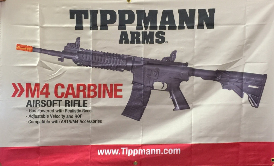 Tippmann Arms Product Banner Featuring the M4 Carbine Airsoft Rifle, 48"x30", Riveted for Durability, PolyBlend.