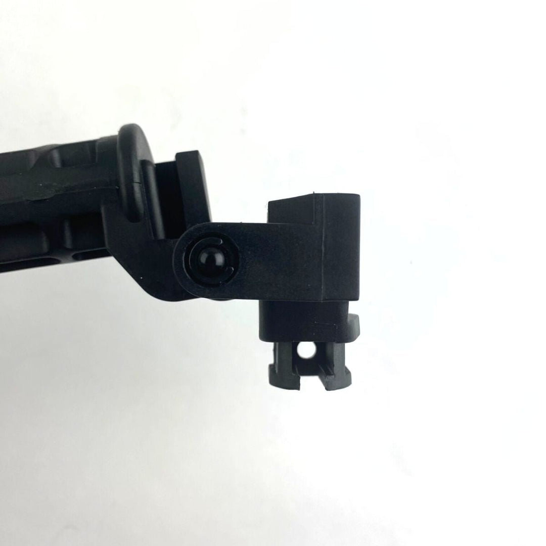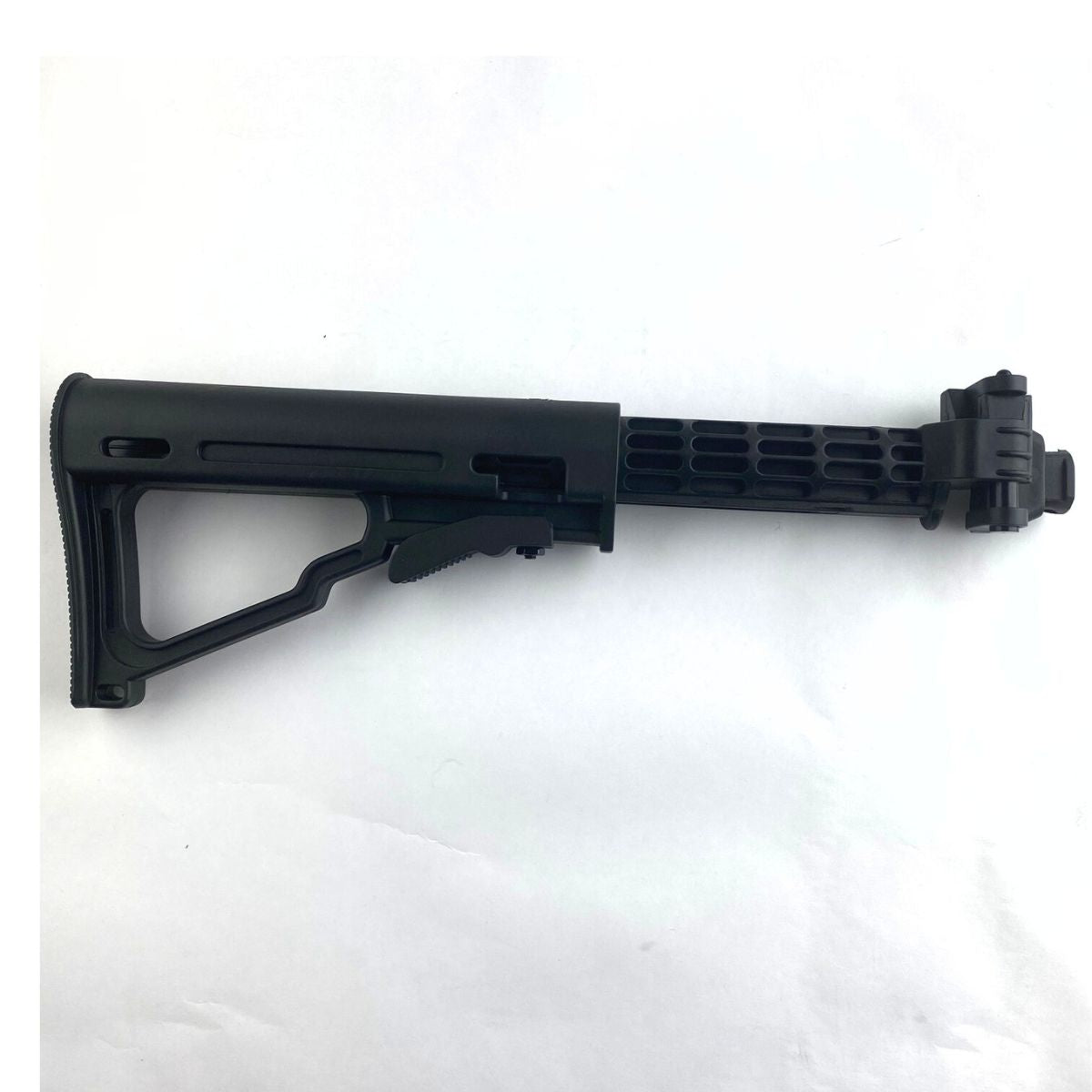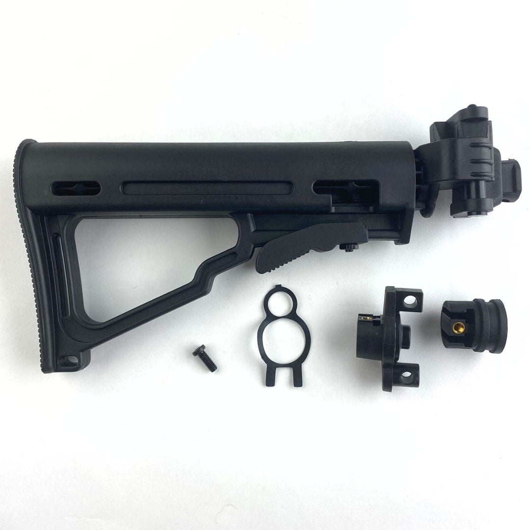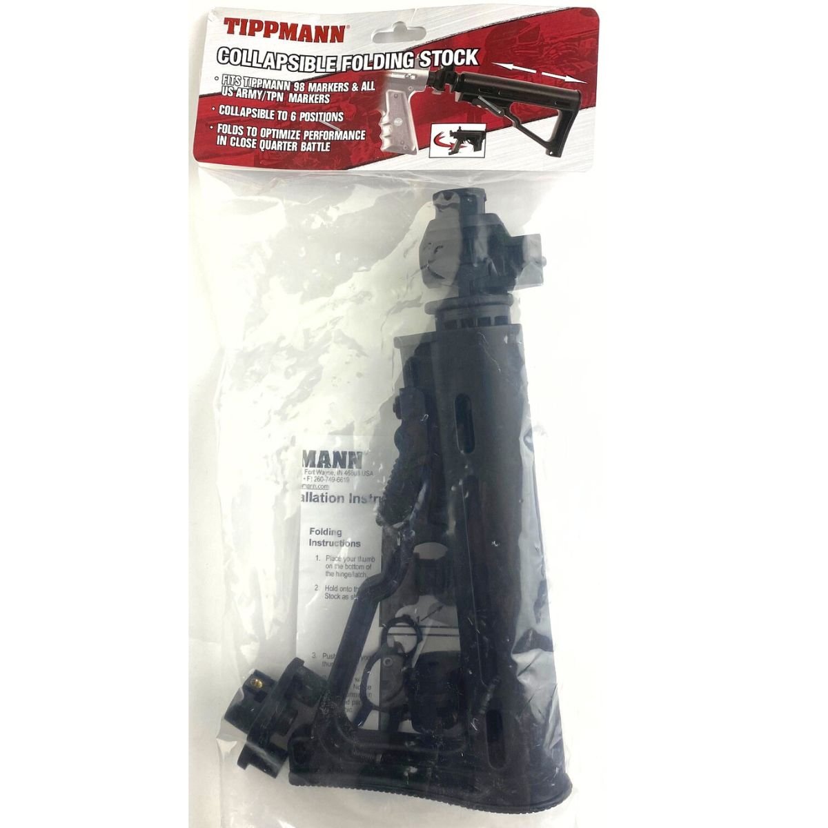The Tippmann Collapsible Folding Stock is a composite stock. The stock has six different horizontal positions that can be adjusted using the lever on the bottom of the stock. This stock also folds to the right of the gun, for close quarter combat or easy storage. There are two different places to attach a sling on this stock. The base attachment is used on all US Army markers, while also coming with an attachment for each of the 98, and A-5 series of markers.