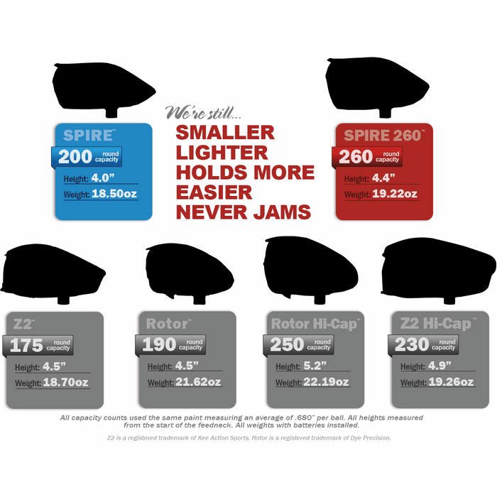 Play with a smaller profile thanks to the vertically stacked gearbox and the unique angular shape of the Spire. By housing the gearbox in a vertical stack inside of the Spire Drive™, the Spire has the lowest height, and narrowest front profile in paintball. Not only that, but the Spire’s True 200™ rating is not just an optimistic product description--the Spire actually holds 200+ paintballs.